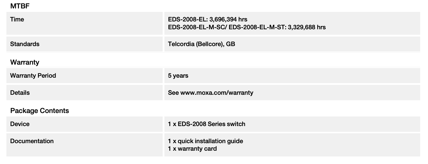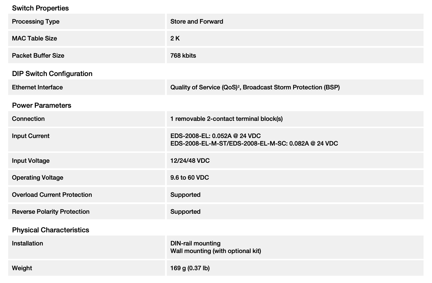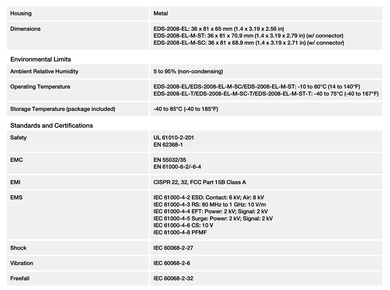 The EDS-2008-EL Series has a 12/24/48 VDC single power input, DIN-rail mounting, and high-level EMI/EMC capability. In addition to its compact size, the EDS-2008-EL Series has passed a 100% burn-in test to ensure it will function reliably after it has been deployed. The EDS-2008-EL Series has a standard operating temperature range of -10 to 60°C with wide-temperature (-40 to 75°C) models also available.