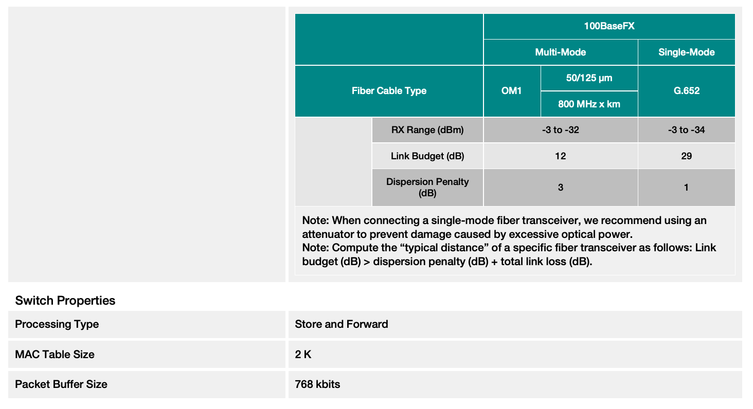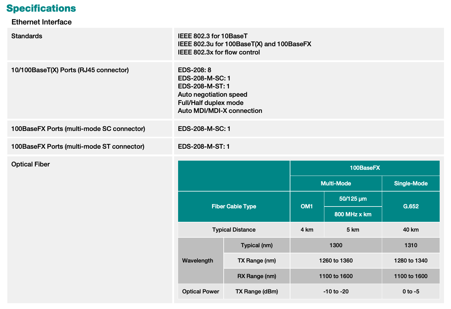 - 10/100BaseT(X) (RJ45 connector), 100BaseFX (multi-mode, SC/ST connectors)