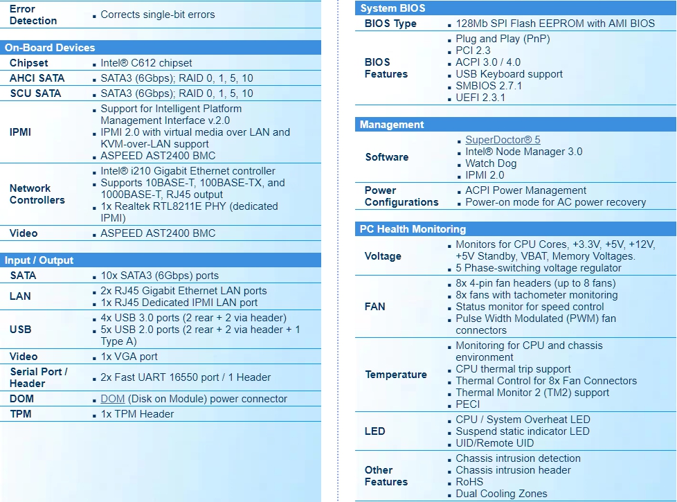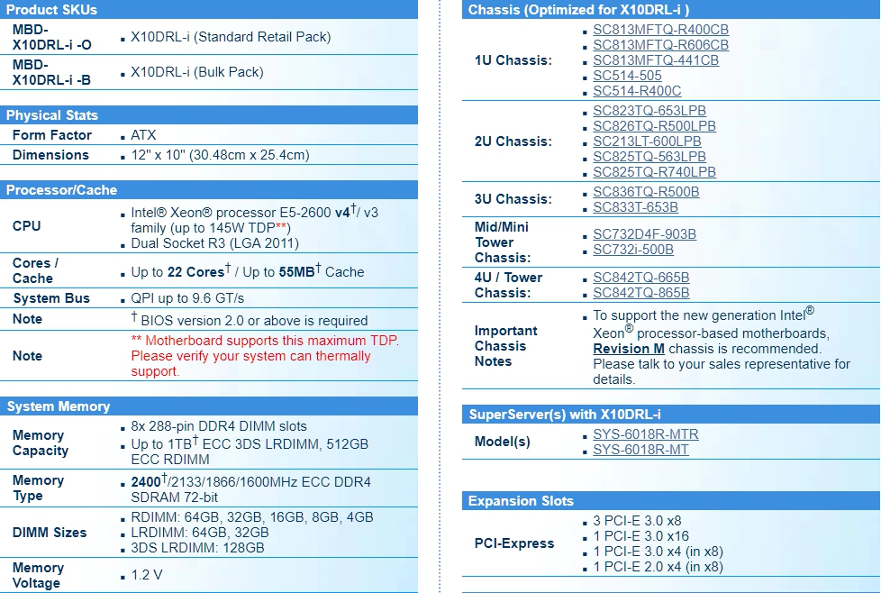 Dual socket R3 (LGA 2011) supports,Intel® Xeon® processor E5-2600,v4†/ v3 family; QPI up to 9.6GT/s,Intel® C612 chipset,Up to 1TB† ECC 3DS LRDIMM , up to DDR4- 2400†MHz ; 8x DIMM slots,3 PCI-E 3.0 x8, 1 PCI-E 3.0 x4 (in x8),1 PCI-E 3.0 x16, 1 PCI-E 2.0 x4 (in x8)