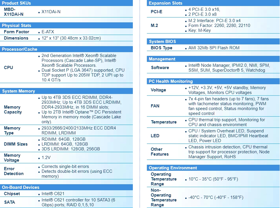2nd Generation Intel® Xeon® Scalable Processors (Cascade Lake-SP), Intel® Xeon® Scalable Processors.Dual Socket P (LGA 3647) supported, CPU TDP support Up to 205W TDP, 2 UPI up to 10.4 GT/s.Intel® C621.Up to 4TB 3DS ECC RDIMM, DDR4-2933MHz; Up to 4TB 3DS ECC LRDIMM, DDR4-2933MHz, in 16 DIMM slots;Up to 2TB Intel® Optane™ DC Persistent Memory in memory mode (Cascade Lake only).