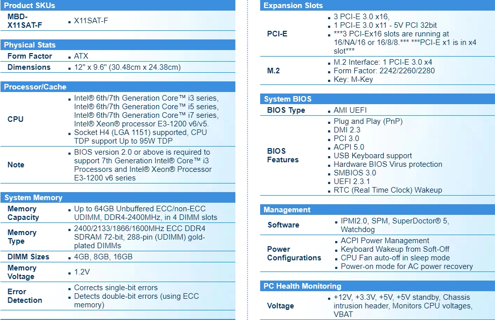 Single socket H4 (LGA 1151) supports,Intel® Xeon® processor E3-1200 v5/v6, Intel® 6th/7th Gen. Core™ i7/i5/i3 series, Intel® Celeron® and Intel® Pentium®,Intel® C236 chipset,Up to 64GB Unbuffered ECC/non-ECC UDIMM DDR4 2400MHz; 4 DIMM slots,3 PCI-E 3.0 x16 (run at 16/NA/16 or 16/8/8), 1 PCI-E 3.0 x1 (in x4), and 1 5V PCI 32-bit slots