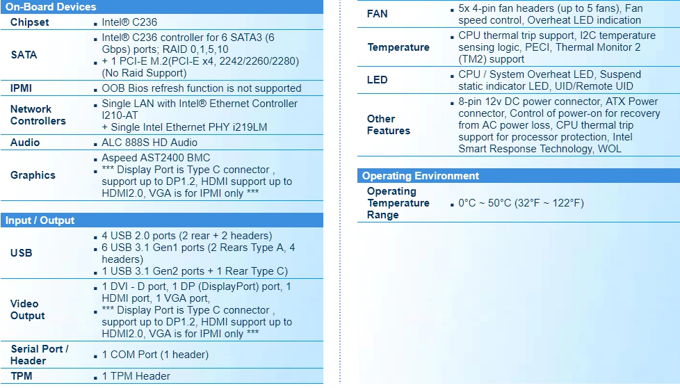 Single GbE LAN with Intel® i219LM - 6 SATA3 (6Gbps) via C236; RAID 0, 1, 5, 10
