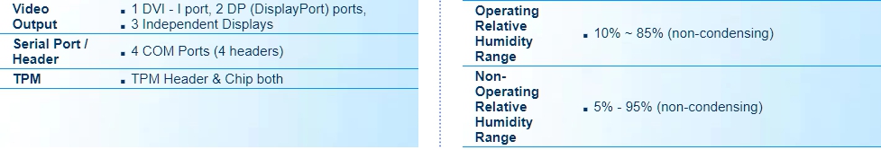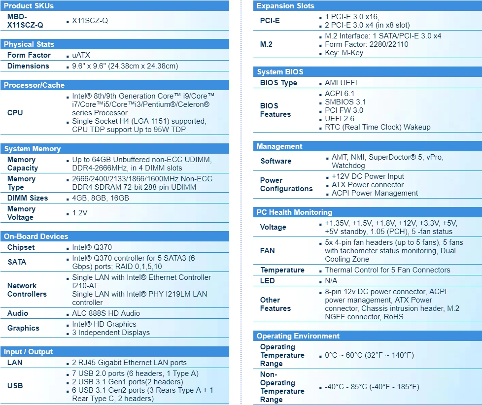 Intel®8th/9thGenerationCore™,i9/Core™,i7/Core™i5/Core™i3/Pentium®/Celeron® series Processor., Single Socket H4 (LGA 1151) supported, CPU TDP support Up to 95W TDP,Intel® Q370,Up to 64GB Unbuffered non-ECC UDIMM, DDR4-2666MHz, in 4 DIMM slots:1 PCI-E 3.0 x16,2 PCI-E 3.0 x4 (in x8 slot),M.2 Interface: 1 SATA/PCI-E 3.0 x4,M.2 Form Factor: 2280/22110,M.2 Key: M-Key
