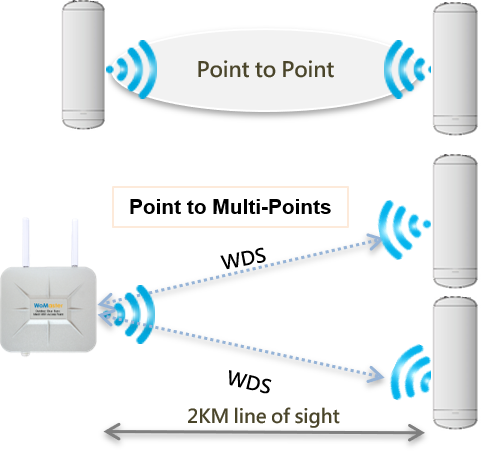 WA212BP supports AP, Client, and WDS modes. Users can configure one as AP mode, and the other as client mode for point to point connection. It is an easy way to extend the wireless range.